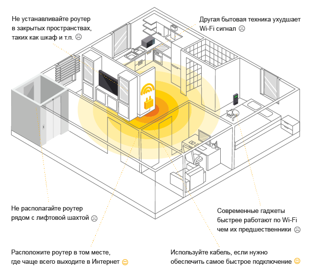 по Wi-Fi на скорости вашего тарифа. - Если вы используете роутер, убедитесь, что он установлен в «правильном» месте. Подробности на схеме: