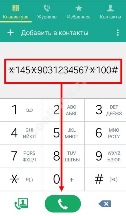 Например: *145*9059876543*200# и кликнуть на клавишу вызова.