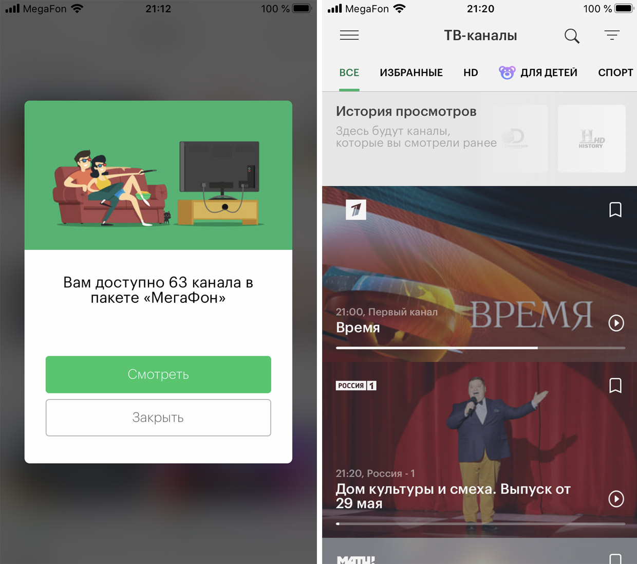 Пакеты «Мировое кино», «Амедиатека», «СТАРТ», «more.tv» — бесплатно на 1 месяц. 50 каналов — без комиссии навсегда для Мегафон ТВ требуется авторизация. Визуализация — через ячейку. Приложение для iOS и Android, Smart TV и на сайте megafon.tv |