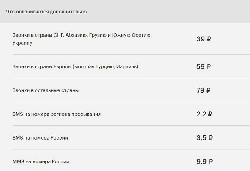 При использовании пользователем лимита в 300 SMS на его счет будет списываться 2,2 рубля за каждое сообщение, отправленное на номер, зарегистрированный в регионе отправления. За отправку SMS по стране взимается 3,5 рубля, по всему миру — 9,9. За каждое MMS внутри страны со счета списывается 9,9 рубля.