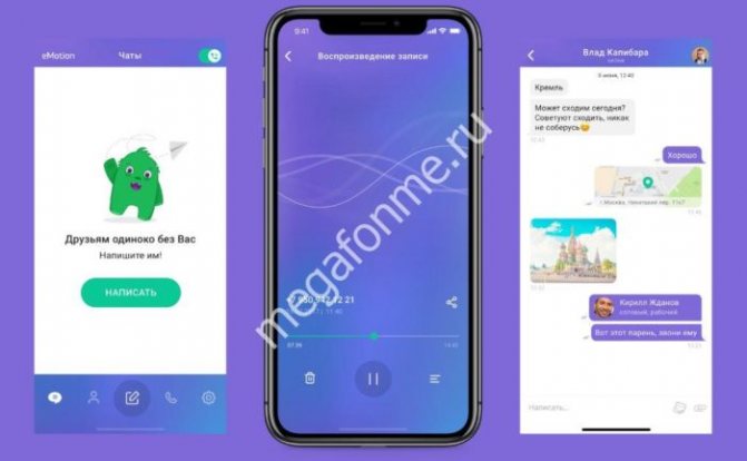 Приложение позволяет отправлять текстовые сообщения и совершать звонки. Для его работы потребляется только Интернет — мобильный или беспроводной. Во время звонков номер абонента остается прежним. Приложение eMotion для работы также доступно для гаджетов Apple. Функционал разработки Мегафон состоит из следующих функций: