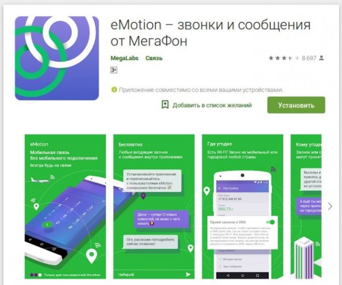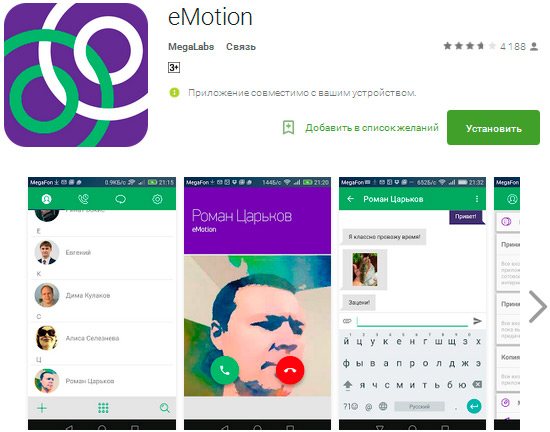 Все абоненты оператора могут скачать приложение eMotion от Мегафон — оно бесплатно предлагается в магазинах программ, встроенных в смартфоны: