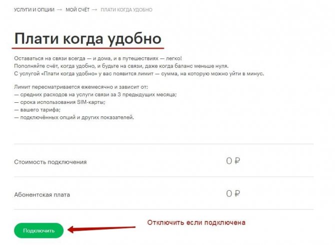 Если активирована услуга «Плати, когда удобно», ее легко можно отключить в личном кабинете абонента.