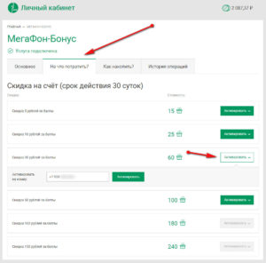 Вы также можете активировать бонусы в личном кабинете на lk.megafon.ru. Пользователь должен войти в свой Личный кабинет, затем перейти в раздел «Тратить бонусы», выбрать вкладку «На что потратить?». Далее необходимо определиться с размером скидки. После выбора нажимаем кнопку «Активировать», по умолчанию указан номер телефона владельца лицевого счета, но при желании вы можете его изменить и перевести бонус Мегафон на баланс другого абонента