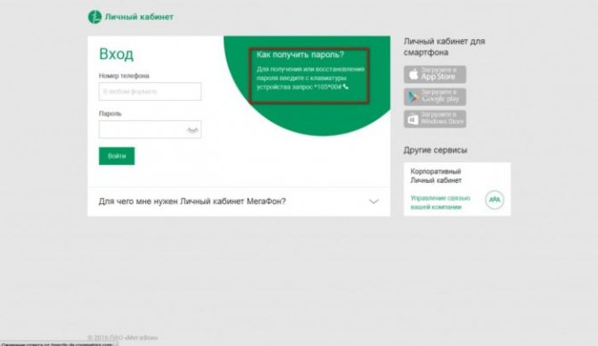 - Зайдите в «Личный кабинет» Мегафона и авторизуйтесь в системе.