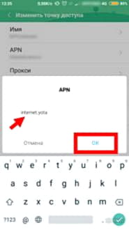- Вбиваем параметры: название «yota»; apn «internet.yota»;