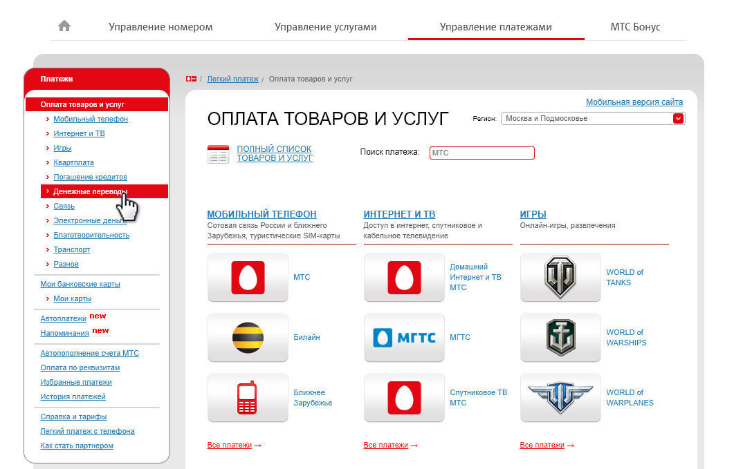 Абонентам МТС удобно иметь личный кабинет для управления своим счетом и тарифами. Вы можете использовать его как с персонального компьютера, так и со смартфона, iPhone или планшета, где есть выход в Интернет. Вкладка «Денежные переводы» находится в разделе «Финансовые услуги». Следующие шаги выполняются так: