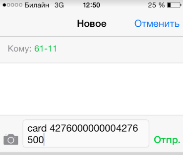 Принцип перевода такой же, как и в Сбербанке №900. В сообщение на 6111 необходимо вставить карту 1234567890123456XXX, где: