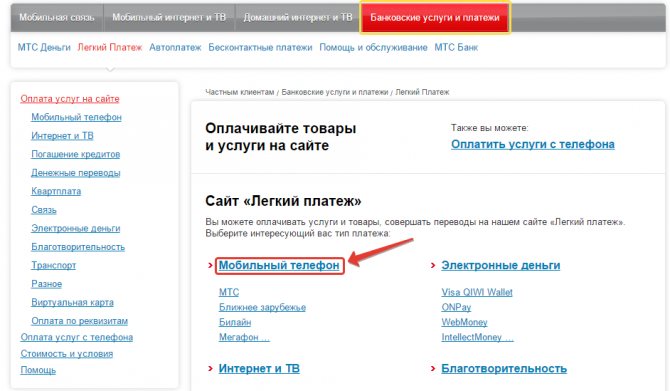 2. Вы также можете перейти на страницу денежных переводов с официального сайта сервиса «Кошелек» — https://payment.mts.ru. После авторизации вам нужно будет немного прокрутить главную страницу вниз и в блоке «Онлайн-платежи» выбрать «Мобильный».