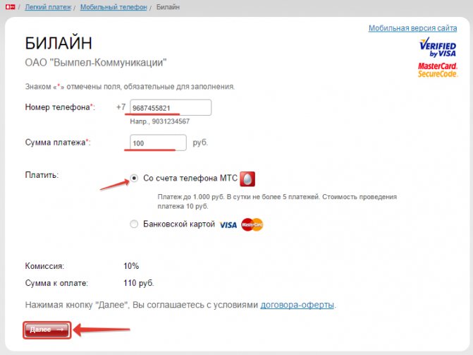 • Убедитесь, что «Учетная запись телефона» выбрана в блоках «Списать с» и «Кому зачислено».