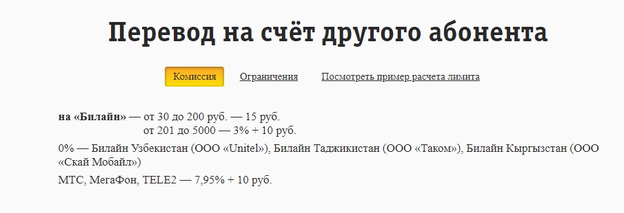 Провайдер установил ограничение на процедуру. Об этом стоит подумать, прежде чем переводить деньги Yota в Билайн. Размер комиссии напрямую зависит от суммы средств. Условия Билайн: