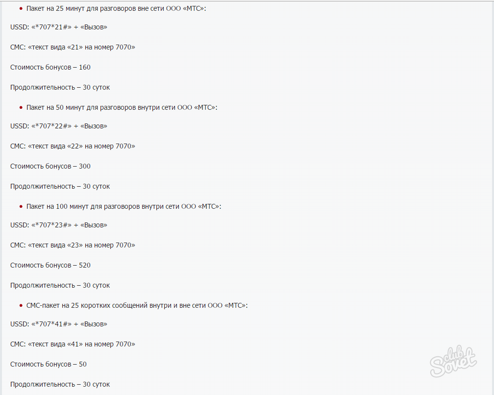 Приобрести пакеты СМС МТС на бонусы можно с помощью следующих команд: