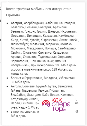 Абхазия, Австралия, Австрия, Азербайджан, Албания, Армения, Бангладеш, Беларусь, Бельгия, Болгария, Бразилия, Великобритания, Венгрия, Вьетнам, Германия, Греция, Грузия, Гонконг, Дания, Джерси, Египет, Израиль, Индонезия, Индия, Иордания, Ирландия, Испания, Италия, Камбоджа, Канада, Казахстан, Катар, Кипр, Китай (кроме Макао), Кувейт, Кыргызстан, Латвия, Литва, Лихтенштейн, Люксембург, Македония, Малайзия, Мальта, Марокко, Монако, Монголия, Нидерланды, Норвегия, Объединенные Арабские Эмираты, Польша, Португалия, Румыния, Сан-Марино, Саудовская Аравия, Сербия, Сингапур, Словакия, Словения, США, Таджикистан, Таиланд, Тайвань, Тунис, Турция, Украина, Филиппины, Финляндия, Франция, Хорватия, Черногория, Чехия, Швеция, Швейцария, Шри-Ланка, Эстония, Южная Корея, Япония 450 руб / сутки, 100 МБ на полной скорости, то есть до 128 кбит / с 700 руб / сутки, 200 МБ на полной скорости, то есть до 128 кбит / с 1600 руб / сутки, 500 или 1 ГБ (в зависимости от страны) на максимальной скорости, затем до 128 кбит / с