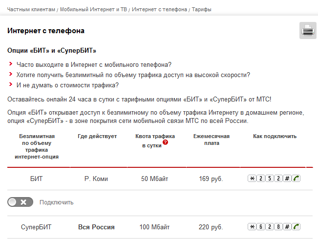 Интернет с телефона МТС Республика Коми Опции «БИТ» и «СуперБИТ»