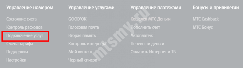 • Личный кабинет МТС. Заходим по адресу mts.ru и в правом углу нажимаем кнопку «Войти», авторизуемся под своим логином и паролем. Во вкладке «Управление услугами» выберите нужную и щелкните значок удаления (красный крестик) рядом с именем.