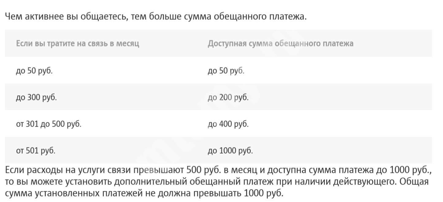 Оператор предоставляет опцию «Обещанный платеж», в рамках которой абоненты могут снимать средства в сумме до 800 рублей в кредит.