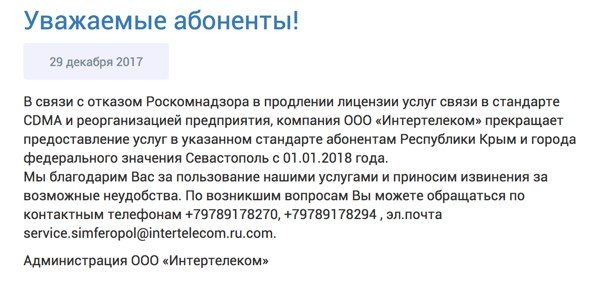 Перестал работать крымский оператор сотовой связи «Интертелеком», работавший в стандарте CDMA-800. Как отмечается на сайте оператора, его лицензия истекла 1 января 2018 года, и Роскомнадзор отказал ей в ее продлении.