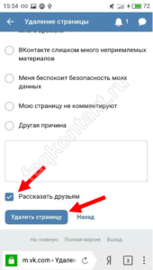 - Ниже данных причин есть маленькая кнопочка «Рассказать друзьям». Над кнопкой уже стоит флажок. Если вам не нужно сообщать об удалении друзьям, флажок лучше удалить;