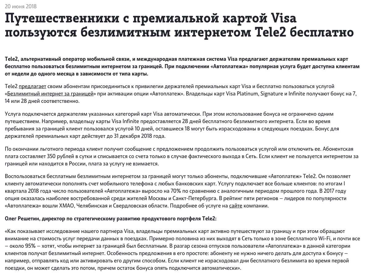 - Сотовый оператор Tele2 предложил держателям карт Visa бесплатный и безлимитный мобильный интернет