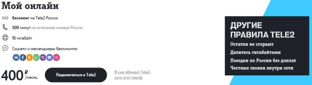 Второй по популярности — мой онлайн-тариф за 400 руб / мес. В эту стоимость входит полный безлимит на звонки на Tele2 Россия, 500 минут на звонки другим абонентам, 15 гигабайт интернета.