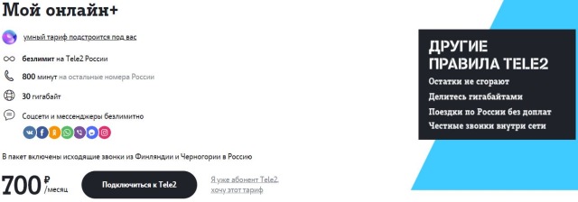 Мой тариф онлайн плюс — один из самых дорогих в линейке тарифов — абонентская плата составляет 700 рублей в месяц. За эти деньги абонент получает: безлимитные звонки на Tele2 по России и 800 минут на других операторов, 30 гигабайт интернета и безлимитные социальные сети и обмен мгновенными сообщениями.