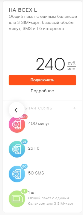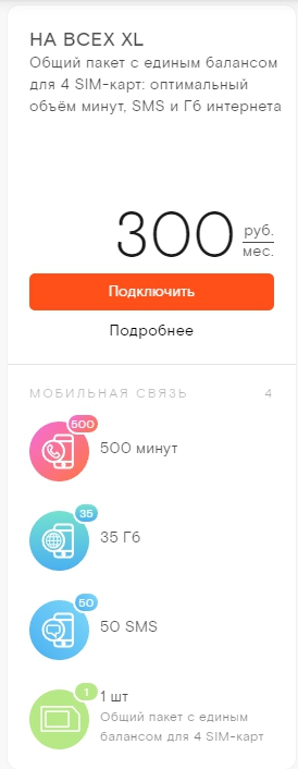 Три SIM-карты с единым балансом. Всем троим доступен пакет услуг. То есть за все варианты семья заплатит не 720 рублей, как если бы была «Супер-SIM L», а всего 240 рублей.